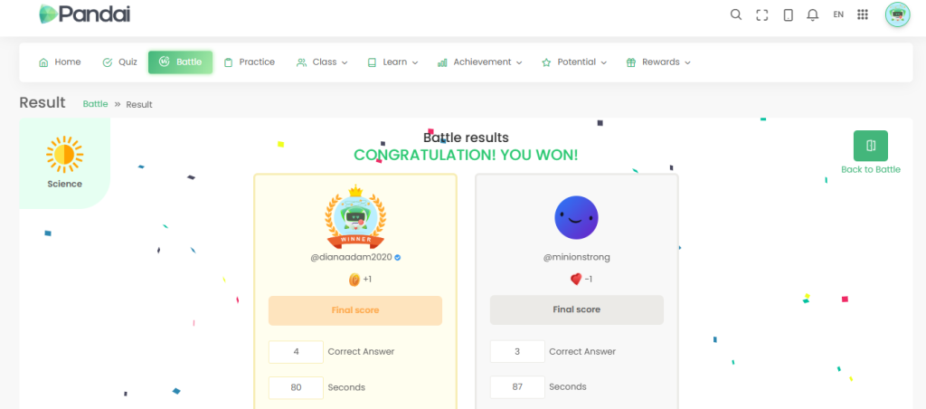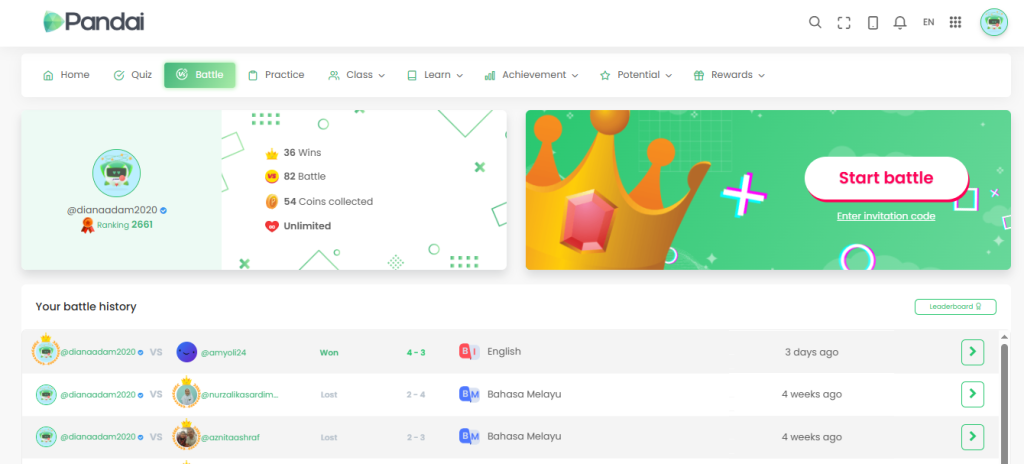 Dalam Pandai App, ada feature Battle dan sistem Leaderboard. Anda boleh cabar kawan anda dan tengok siapa paling konsisten, atau sekadar lawan diri sendiri untuk naikkan rank. Macam game multiplayer, tapi lagi best sebab boleh main sambil belajar.