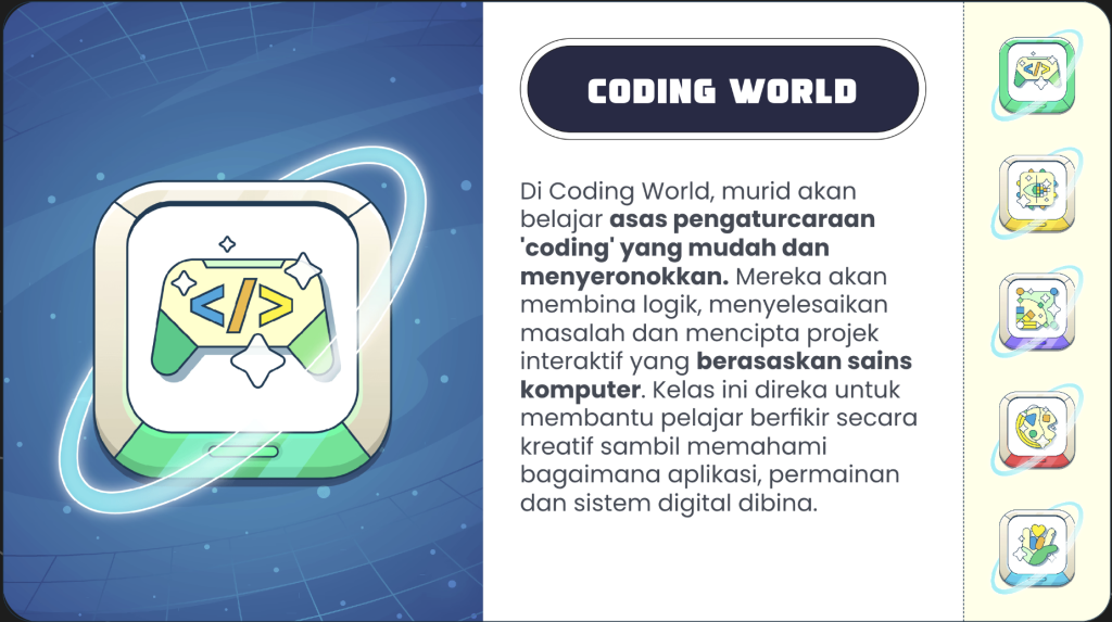 Semua ini dalam bentuk kelas interaktif, projek kecil, aktiviti hands-on dan panduan tutor sebenar. Sesuai untuk pelajar yang: