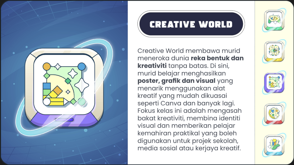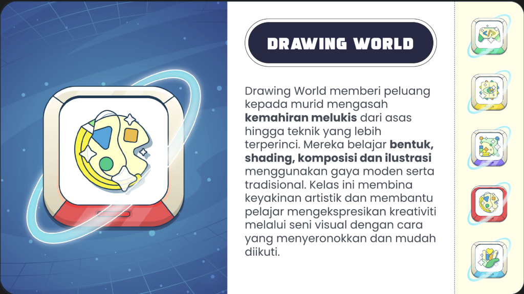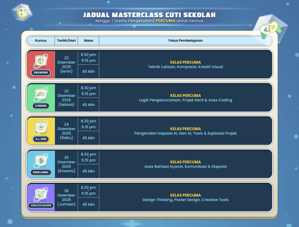 Semua kelas disampaikan secara online interaktif dan hands-on, menjadikan pembelajaran lebih seronok, fleksibel dan sesuai untuk pelajar dari semua tahap. Program ini akan membantu pelajar membina kreativiti, keyakinan dan skil masa depan — sambil memanfaatkan cuti sekolah dengan aktiviti berfaedah!