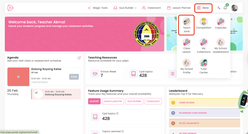 Teach Zone turut diperkukuh dengan sokongan teknologi AI Pandai, yang membantu guru dalam perancangan dan pengayaan pengajaran.