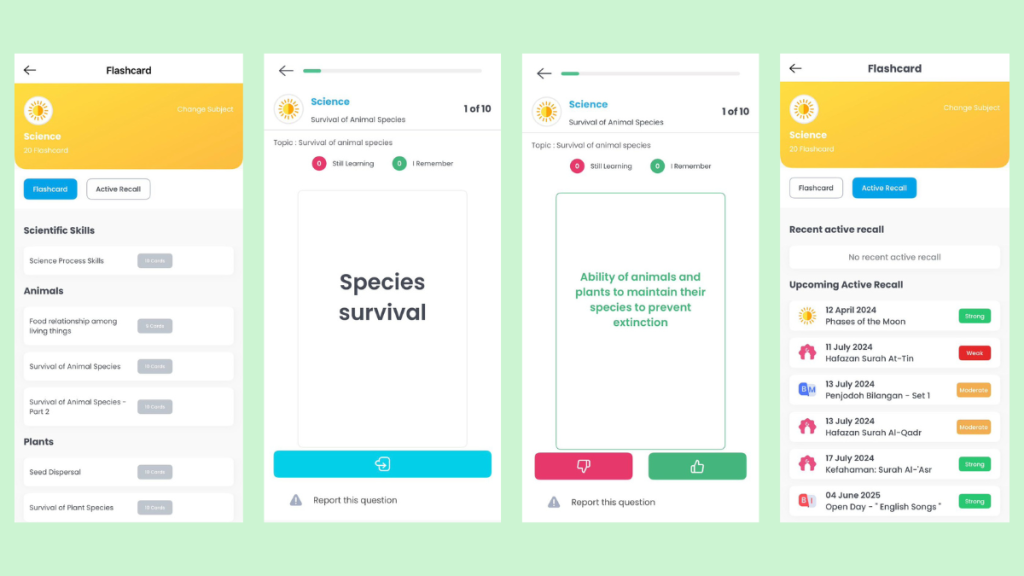 Pandai Flashcards also use spaced repetition, a scientifically proven technique that improves long-term memory retention (Smith & Scarf, 2020). By revisiting information at the right time intervals, you strengthen recall and deepen understanding.